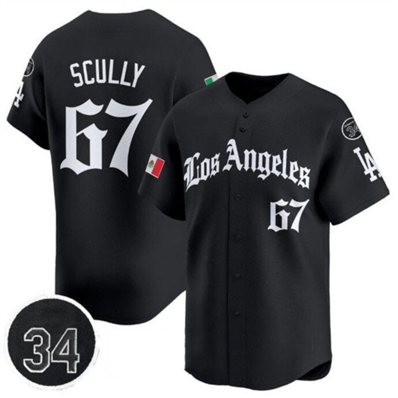 OCD620340292455Los Angeles Dodgers #67 Vin Scully Black Mexico 2025 LA Gothic Style With Fernando Patch Vapor Premier Limited Stitched Baseball Jersey